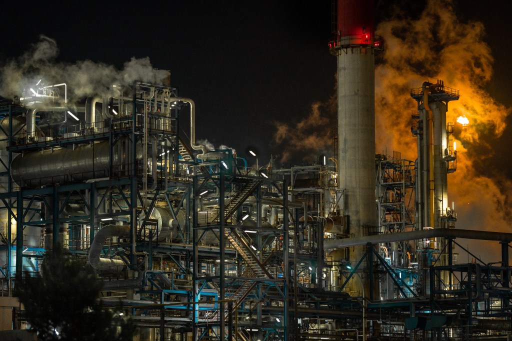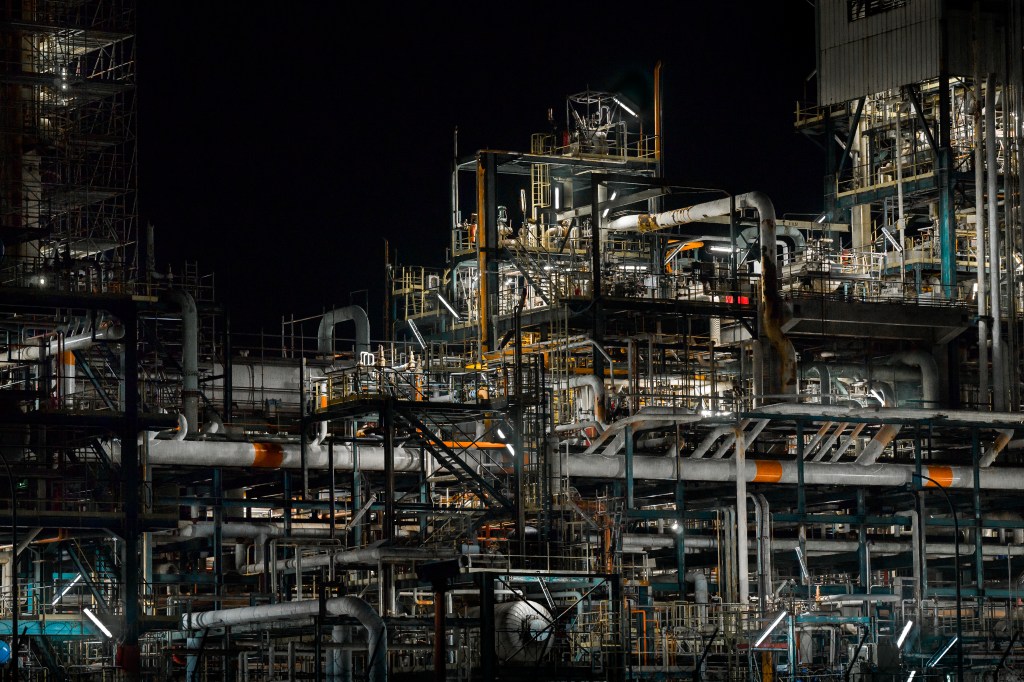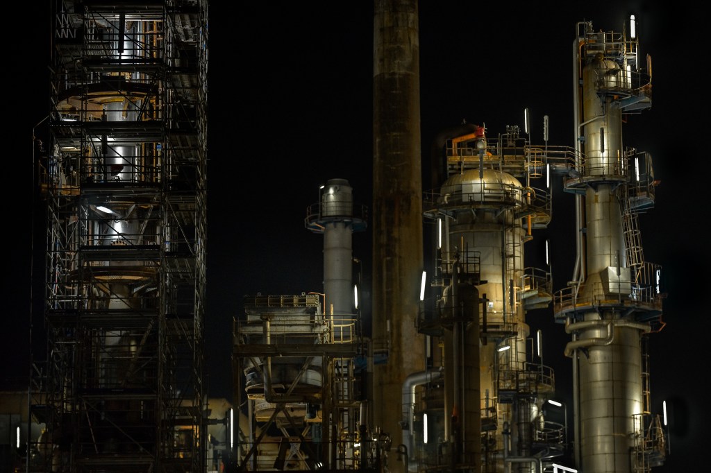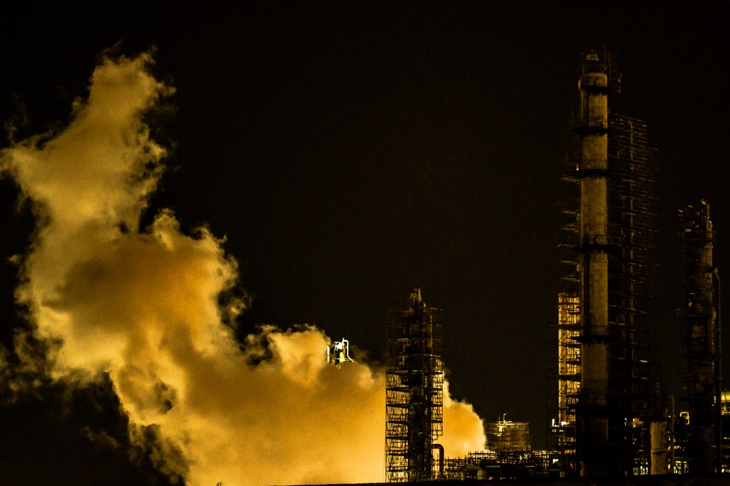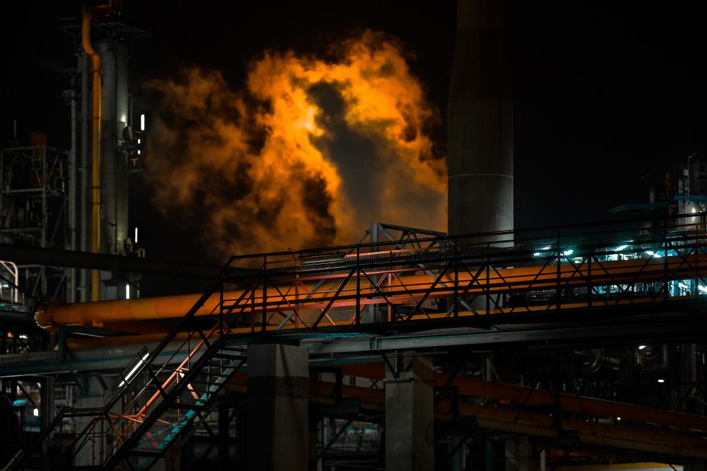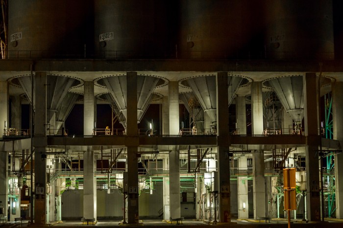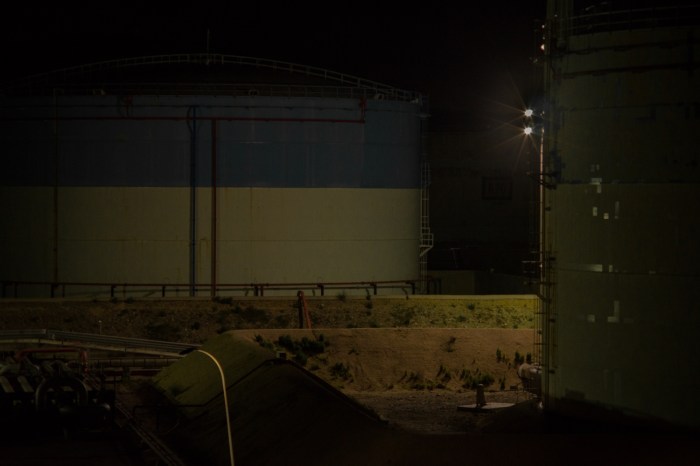 A la nuit tombée, la nature s’efface devant les nombreuses raffineries illuminées, cathédrales dédiées à la déesse industrie. Ça fume! Ça clinque ! Ça pue le gaz et le pétrole ! Ça circule dans ces milliers de tuyaux qui s’entrelacent dans une logique toute organique. Des géants de fer et d’acier qui ne cessent d’ ingurgiter, ruminer, digérer, expulser… Face à ces machines insomniaques, une frayeur dystopique qui se mêle à une fascination esthétique.